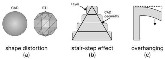 According to the literature, the major issues arising during the design and pre-processing stages are as follows. First, during the process of converting CAD models into STL files composed of small triangles, geometric fidelity may not be sufficiently preserved, which can lead to information loss and result in shape distortions []. This phenomenon is illustrated in Figure 3a. Such distortions are particularly problematic for models with curves or complex geometries, where chordal errors frequently occur. To reduce these errors, a denser mesh is often used, but this increases the file size and computational load during slicing [].