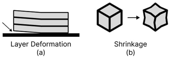 First, thermal variations and the accumulation of residual thermal stress are widely reported as the primary causes of geometric errors. Printed materials tend to shrink during the cooling process, and interlayer temperature gradients can result in asymmetric thermal stress []. These stresses may cause overall warping, localized lifting, or tilting of the print, potentially leading to collisions with the recoater or print failures []. Although the severity of these effects varies with process and material, they are commonly observed across AM technologies. For example, in material extrusion (ME) processes such as fused deposition modeling (FDM), warping may occur due to filament shrinkage upon cooling []. In powder bed fusion (PBF) processes like selective laser melting (SLM) and electron beam melting (EBM), rapid heating and cooling can create steep thermal gradients, resulting in high residual stress []. These thermal effects often lead to geometric distortions such as warping or shrinkage. These geometric accuracy concerns tend to be more stringent in medical applications due to patient-specific requirements, whereas industrial contexts may prioritize repeatability and structural performance. Figure 4 illustrates (a) a schematic of layer deformation caused by thermal stress and (b) a simplified shrinkage model comparing the designed geometry to the printed output.
