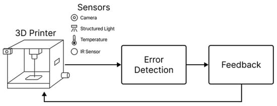 AM is a process that often requires continuous operation over several hours. During this time, the quality of the printed output can be affected in real time by various physical factors such as temperature fluctuations, vibrations, and the wear of mechanical components. Consequently, even when the initial setup is highly precise, unforeseen variables that occur during the printing process can frequently lead to print failures. This issue is particularly critical in long-duration prints, where constant user supervision is not feasible. In such cases, the need for systems capable of detecting and autonomously responding to errors in real time has been increasingly emphasized. To help readers intuitively understand the structure and data flow of such systems, Figure 5 presents a simplified schematic illustration of a typical sensor-integrated real-time monitoring setup in AM.