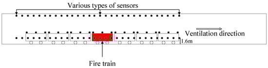 In the figure, the black filled circles represent various types of sensors, while the red rectangle indicates the carriage where the initial fire originated. The direction of the arrow illustrates the wind direction, which was analyzed in the simulation by varying wind speeds to observe changes in the temperature field.