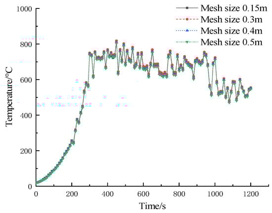 The temperature trend directly above the fire source for mesh sizes ranging from 0.15 m to 0.5 m is illustrated in Figure 4. It can be observed that the temperature trends across the four grid sizes are consistent, with values remaining largely similar. The maximum error observed does not exceed 15 °C. Therefore, for mesh sizes of 0.15 m, 0.3 m, 0.4 m, and 0.5 m, the fire simulation results are deemed accurate. However, it is important to note that the mesh size significantly affects the simulation time on the computer. To ensure relative accuracy, a mesh size of 0.3 m was found to yield results most similar to those obtained with a mesh size of 0.15 m while also providing relatively high computational efficiency, utilizing a total of 1,066,250 meshs.