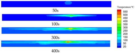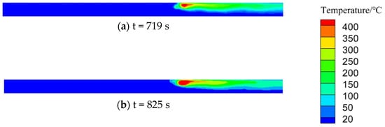 Through calculations, it is determined that when the wind speed exceeds 2.3 m/s, the compartments on the downwind side of the fire source, located between 0.5 m and 3 m, have an increased likelihood of ignition. Numerical simulation software was employed to model the tunnel fire at a wind speed of 2.4 m/s. The results indicate that adjacent compartments on the downwind side of the fire begin to ignite at 719 s. Furthermore, by 825 s, the coal within these compartments is ignited, leading to the spread of the fire. The temperature distribution of the fire is illustrated in Figure 10.