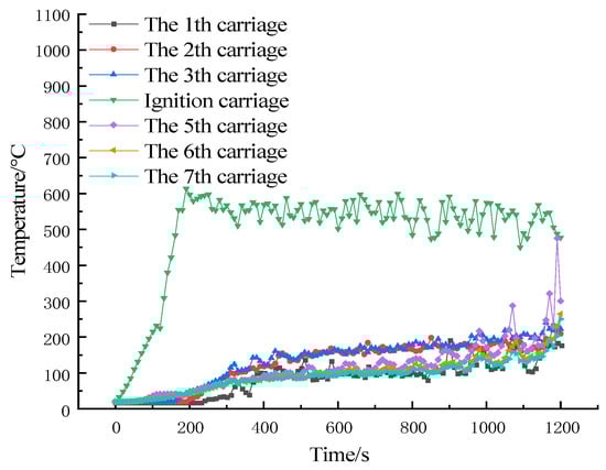 As illustrated in Figure 5, under windless conditions, when the heat release rate of a single fire source reaches its peak, the temperature of the ceiling is notably elevated, reaching 550 °C. The vertical height is 3.9 m, at which the exposed surface of the coal transported in the carriage has reached a temperature of 230 °C. Given that the general ignition point of coal is approximately 300 °C, the temperature has not yet reached this critical threshold. Consequently, the risk of fire spreading to adjacent carriages remains relatively low. The temperature did not reach the ignition point of the coal, resulting in a relatively low risk of fire spreading to other train carriages. However, in the actual environment of heavy railroad tunnels, there is typically a certain wind speed. After simulating the fire under a wind speed of 1 m/s, the surface temperature of the coal layer in the train carriages is illustrated in Figure 6.