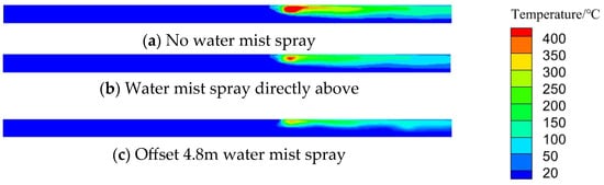 In Figure 10, panel (a) illustrates the downwind side of the carriage coal fire at the onset of the fire, where the temperature is relatively low. At this stage, the critical wind speed for the fire remains effective. However, as the heat release rate of the carriage coal gradually increases, the overall heat release rate of the fire rises, leading to the invalidation of the critical wind speed. This phenomenon is further evidenced in Figure 10b, where the high-temperature smoke exhibits the occurrence of inverse recession. This effect is primarily attributed to the increase in fire duration, which correlates positively with the heat release rate. It can be concluded that at 825 s into the fire, the combustion of coal produces an open flame. As the duration of the fire increases, the potential for its spread also rises. The heightened heat release rate exacerbates the smoke countercurrent phenomenon, which may facilitate the fire’s spread to the upwind side. Concurrently, factors such as wind speed and thermal resistance may contribute to the fire spreading downwind. Therefore, it is essential to control wind speed and implement additional emergency measures. Currently, the primary fire prevention and suppression strategy in tunnels involves the use of water mist sprinklers. Water mist spraying effectively reduces the high temperatures generated by the fire and helps prevent its spread.