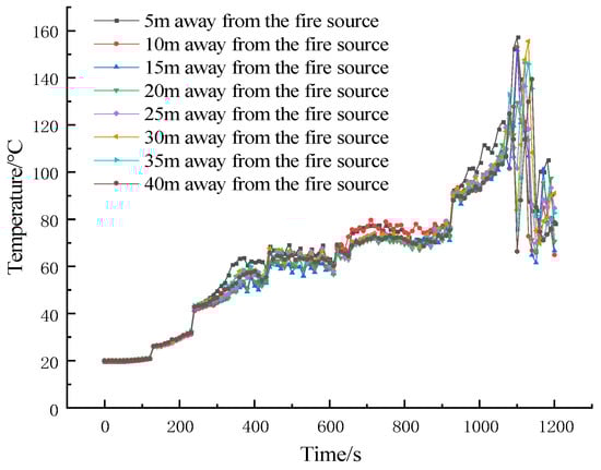 At the time of the fire, the temperature at a vertical height of 1.6 m on both sides of the compartment was essentially uniform. As illustrated in Figure 12, the temperature change on the left side of the compartment indicates that approximately 430 s after the fire ignited, the local temperature exceeded 60 °C. This poses a significant threat to personnel attempting to escape. Subsequently, the temperature exhibited an upward trend, primarily due to its proximity to the high-temperature smoke layer. The primary reason for the temperature variation with vertical height is its predominant interaction with the high-temperature smoke layer for heat exchange and warming. Given that both ends of the tunnel serve as open exits, the accumulation of the smoke layer remains relatively shallow. Furthermore, the movement of airflow can lead to gradual temperature changes, whether increasing or decreasing, resulting in a slow upward trend in temperature.