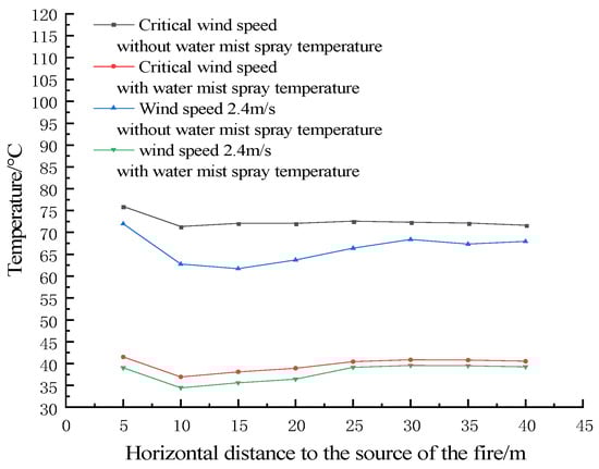 - This study investigates the relationship between the water mist trajectory and wind speed. The trajectory of the water mist was analyzed under both horizontal and vertical initial speeds of 9.9 m/s. It was found that the water mist offset was 4.1 m at the critical wind speed and 4.8 m at a wind speed of 2.4 m/s. Furthermore, the offset was optimized from the initial position of the water mist spray, resulting in a significant cooling effect. Specifically, the peak temperature on the downwind side of the fire source was reduced from 77 °C to 42 °C at a height of 1.6 m, 400 s after the initiation of the spray. At this height, under critical wind speed conditions, the peak temperature on the downwind side of the fire source decreased from 77 °C to 42 °C after 400 s, while at a wind speed of 2.4 m/s, the peak temperature was reduced from 71 °C to 39 °C. The ambient temperature at a height of 1.6 m aligns with the endurance temperature necessary for personnel escaping from the optimized water mist spraying conditions.