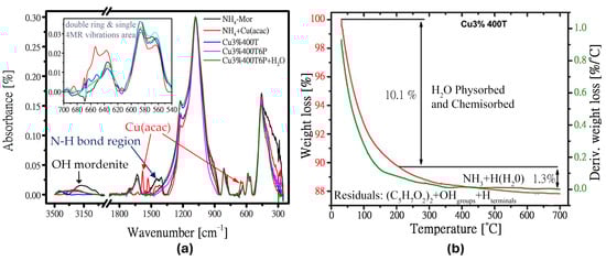 (a) IR spectra from family sample Cu3% through the different stages of the test conversion cycle. High-frequency OH stretching vibration diminishing bands indicate ion exchange, as Cu ions have substituted some of the protons of the bridged terminal silanol groups. Inset: a slight intensity decrease and red shifts from reacted samples in the double ring and single 4-membered ring vibrations suggest an environmental distortion related to the copper insertion. (b) Thermogravimetric profile from the activated Cu 3%400T sample, calcined at 400 °C; the curves show the material stability and very low acetylacetonate residuals.