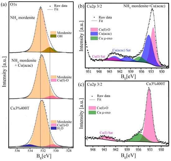 XPS spectra for (a) O1s region for the parent mordenite (up), exchanged mordenite Cu3% (NH4-Mor + Cu(acac)2 mixture) (middle), and calcined Cu3% 400T sample (down). The main signal’s slight changes demonstrate the mordenite’s stability during the mentioned stages. (b) Cu2p3/2 region for exchanged mordenite where the main copper contribution assigned to the Cu(acac)2 is noticed; it is important to sign the emergent formation of the -oxo species type since the ground process; (c) Cu2p region from calcined Cu3% 400T sample after calcination/activation process where Cu(acac) contribution has vanished and -oxo and Cu(I) species type are suggested at high BE.
