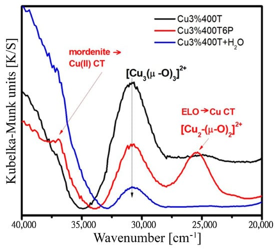 Cu3% sample family at different conversion step stages, the band assigned to trimeric species [Cu3(-O)3]2+ near 30,000 cm−1, and the same-intensity ∼23,000 cm−1 band in the Cu3%400T6P sample after methane contact ascribed to the ELO (Extra Lattice Oxygen) → Cu CT transitions of a possible intermediate bis(-oxo) dicopper core. NH4-Mor reacted at the same test reaction experiment, which showed no bands corresponding to active methane oxidation sites (see Supplementary Materials Figure S3).