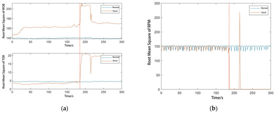 Time domain analysis of near-bit data. (a) Root Mean Square of WOB and TOR; (b) Root Mean Square of RPM.