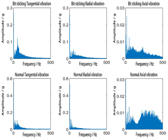 As shown in Figure 3, a comparison is made between tangential, radial, and axial vibrations under normal drilling and bit sticking conditions. During normal drilling, the amplitude of tangential vibration is within 0.2 g, radial vibration within 0.2 g, and axial vibration within 0.03 g, maintaining relatively stable vibration amplitudes. The frequencies of tangential, radial, and axial vibrations are primarily concentrated below 200 Hz. Before the occurrence of a stuck pipe event, the tangential, radial, and axial vibrations are similar to those observed during normal drilling, indicating no significant deviation. After the stuck pipe event, vibrational amplitudes significantly decrease, and the energy levels drop close to zero, suggesting vibration disappearance. Despite this, the frequency components of the signals remain mainly concentrated below 200 Hz.