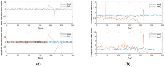 Vibration analysis of near-bit Data. (a) Axial Vibration Mean Value and Tangential Vibration Mean Value; (b) Axial Vibration RMS Value and Tangential Vibration RMS Value.
