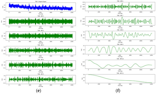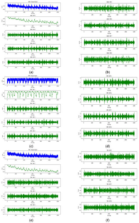 IMFs of WOB, torque, and RPM signals after VMD. (a,b) IMFs of WOB signals after VMD; (c,d) IMFs of TOR signals after VMD; (e,f) IMFs of RPM signals after VMD.