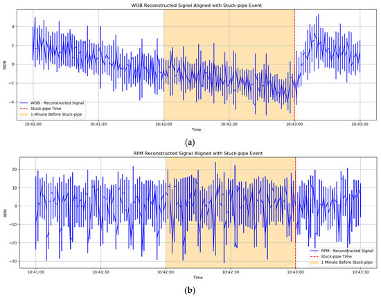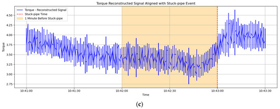 Extract meaningful features from the reconstructed signals during normal drilling. (a) WOB Reconstructed Signal Aligned with Stuck-pipe Event; (b) RPM Reconstructed Signal Aligned with Stuck-pipe Event; (c) TOR Reconstructed Signal Aligned with Stuck-pipe Event.