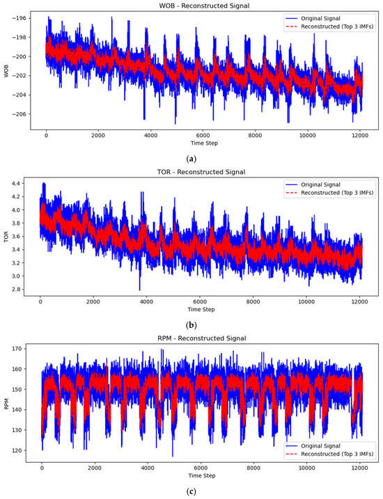Reconstructed WOB, TOR, and RPM signals after VMD. (a) Comparison Between WOB Original Signal and Reconstructed Signal; (b) Comparison Between TOR Original Signal and Reconstructed Signal; (c) Comparison Between RPM Original Signal and Reconstructed Signal.