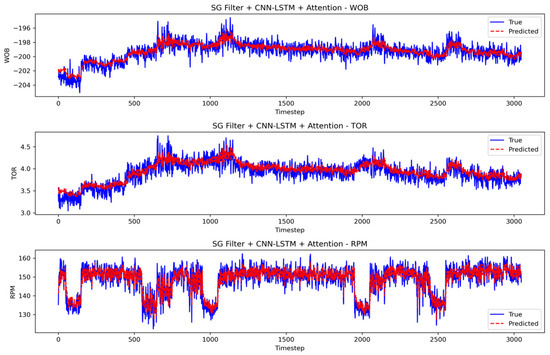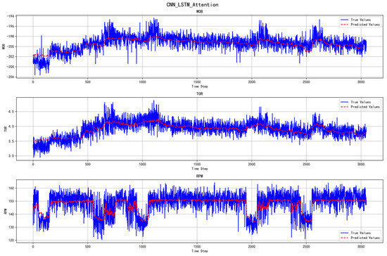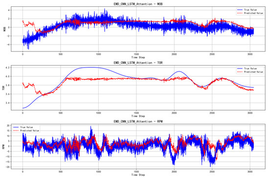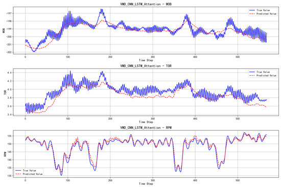 CNN is used to automatically extract local features, while LSTM captures long-term dependencies [33,34]. In theory, such models can handle complex time-series data. As shown in Figure 21, without physical mechanism constraints, the model’s performance may not be optimal, as it cannot fully understand the physical laws of the drilling process and relies solely on the patterns within the data for training. The Attention mechanism can help the model focus on the most important moments and features, which is crucial for complex time-varying signals in the drilling process. Nevertheless, even though Attention can significantly enhance model performance, it still falls short compared to the VMD model with physical mechanisms.
