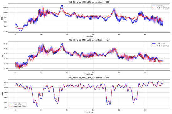 This model incorporates physical mechanism constraints based on VMD. Integrating physical knowledge typically enhances the model’s prediction accuracy because it enables the model to better capture the physical laws involved in the drilling process. This improves the fit of drilling parameters, especially for complex variables like RPM and TOR. After incorporating physical mechanisms, the model can better constrain its output, resulting in smaller prediction errors, higher R2 values, and reduced MSE and MAE.