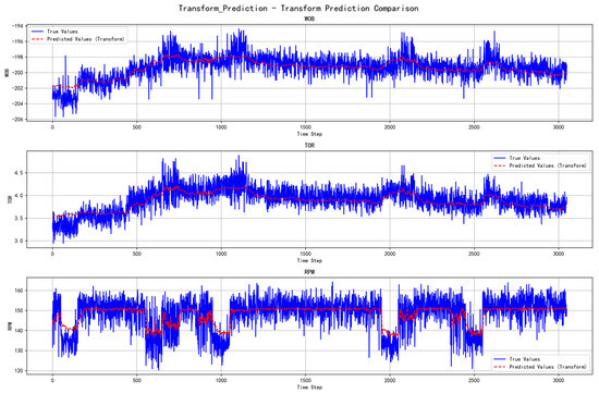 The Transform model, as a technique based on transformation, can effectively perform feature transformation and modeling to some extent. As shown in Figure 20, compared to complex deep learning models like VMD + CNN-LSTM-Attention, it lacks the ability to capture fine-grained features of complex signals. Therefore, while the Transform model performs well in some scenarios, its prediction accuracy is inferior to the VMD model when dealing with complex drilling data. Additionally, the Transform model lacks in-depth exploration of temporal characteristics. Unlike LSTM, it cannot remember long-term historical information, nor does it have an Attention mechanism to dynamically adjust importance weights. This affects its prediction accuracy for complex variables such as RPM and TOR.
