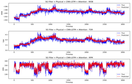 As shown in the comparison between Table 4 and Table 8. Compared to traditional filtering methods such as Savitzky–Golay (SG) and Variational Mode Decomposition (VMD), deep learning-based preprocessing exhibits clear advantages in capturing complex, nonlinear patterns and enhancing model performance. As shown in the experimental results, the SG + CNN-LSTM-Attention method yields relatively high errors, particularly in RPM prediction (MSE = 11.4169, R2 = 0.7128), indicating limited capacity in noise suppression and feature retention. In contrast, when physical constraints are incorporated, the SG-based model shows moderate improvement (R2 = 0.7968 for RPM) but still lags behind VMD-based approaches.