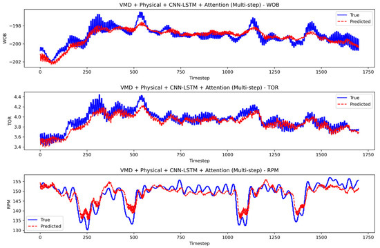 To address the potential limitations of single-step prediction (typically 1–5 s ahead), this study further introduces a multi-step forecasting experiment, extending the prediction horizon to three steps (approximately 15 s). This adjustment aims to better align the model with real-world requirements for advance warning, especially in high-risk formations, deep well drilling, or complex load conditions where the early detection of abnormal trends can enable timely operational interventions and reduce the risk of stuck pipe incidents.