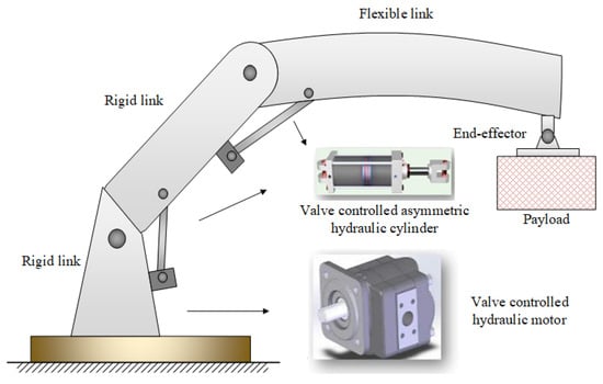 Hydraulically driven flexible robotic arms (HDFRAs) have become core actuators in heavy-duty industrial equipment and special robotics due to their high power density and adaptability to complex environments, widely applied in precision operations such as spacecraft module docking and nuclear waste handling [,,]. However, the inherent multi-physics coupling characteristics—such as mechanical flexibility, hydraulic nonlinear dynamics, and electromechanical interactions—result in significant multi-timescale dynamic behaviors []. Specifically, the low-frequency flexible vibrations, mid-frequency joint motions, and high-frequency hydraulic pressure fluctuations form cross-scale dynamic coupling, which traditional single-timescale modeling and control methods struggle to coordinate [,]. During contact operations, such coupling effects amplify end-effector positioning errors, severely limiting high-precision task execution [].
