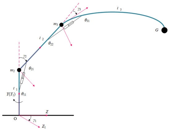 where is the positive definite matrix; is the stiffness matrix of the flexible link 3; , encompassing Coriolis forces, centrifugal forces, and gravitational effects; denotes the joint angles; denotes the modal coordinates; and denotes the control torques.