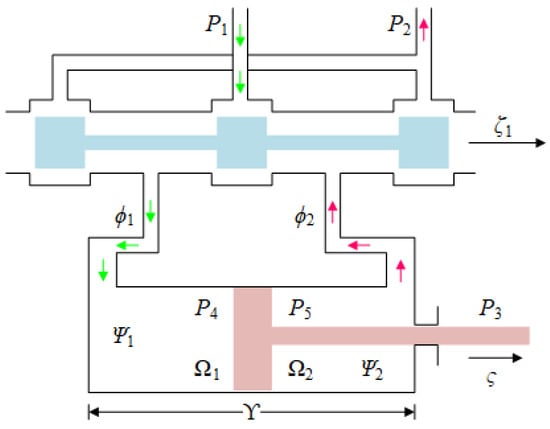 Based on the fluid continuity equations and Newtonian dynamics laws [], the pressure–flow rate equations for the valve-controlled hydraulic cylinder are established: