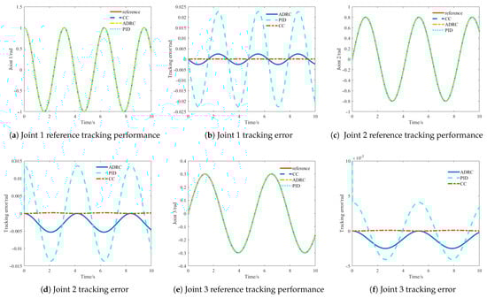 Figure 7 demonstrates the trajectory tracking performance under lumped uncertainties. From Figure 7a,c,e, it can be seen that after adding lumped uncertainties, links 1, 2, and 3 of the robotic arm still maintain certain tracking capability for the desired trajectory under all three control methods. However, Figure 7b,d,f reveal significant fluctuations in their tracking errors, with ADRC showing the most pronounced fluctuations, followed by PID, and finally, CC exhibiting the smallest variations. Clearly, even with uncertain disturbances, the CC method’s maximum tracking error still meets steady-state requirements, and its stability outperforms both ADRC and PID methods.