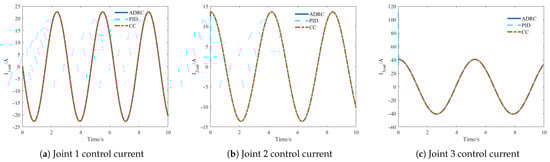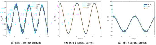 The control current comparison in Figure 8 further reveals the system’s dynamic characteristics. The output control currents of the three methods show that when affected by uncertain disturbances, ADRC and PID methods exhibit obvious and severe fluctuations. These current fluctuations directly translate to motor torque output, causing jitter in the robotic arm’s end-effector. In contrast, the CC method shows much milder current fluctuations under external disturbances, further demonstrating its superiority in terms of output current stability.