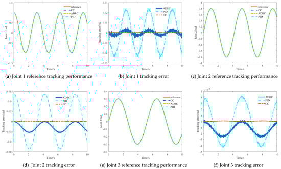 Under nominal modeling conditions (excluding uncertainties and disturbances), joint tracking performance was experimentally evaluated, with simulation outcomes visualized in Figure 5 and Figure 6. From Figure 5, which compares the tracking performance of the robotic arm under three different control methods, the following can be observed.