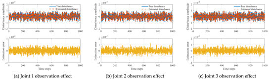 Figure 9 reveals the core advantage of the CC method—the observer’s compensation effect on lumped uncertainties. The observer’s disturbance estimation for all three links shows that the estimation error remains below 10% of the original disturbance amplitude. This high-precision real-time estimation capability enables real-time disturbance compensation, fundamentally ensuring the aforementioned tracking accuracy and control stability.