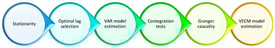 The methodology of this study followed a series of essential steps for analyzing the dynamic relationships between the selected variables. Stationarity tests were used to verify the suitability of the series for econometric analysis, followed by selecting optimal lags based on information criteria. Cointegration was assessed through dedicated tests, identifying long-term relationships, and Granger causality analysis allowed exploring the directions of the relationships between variables. Model validation included diagnostic tests, and the results were interpreted in relation to short-term adjustments and convergence towards long-term equilibrium.