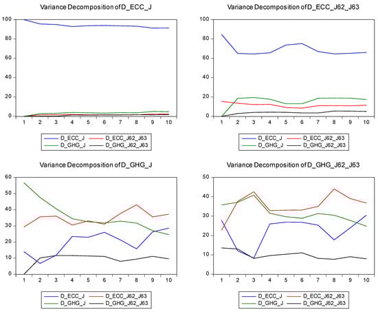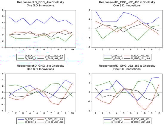 Selecting optimal lag length is essential for accurate VAR or VECM estimation. Criteria used include Akaike Information Criterion (AIC) [,], Schwarz Bayesian Information Criterion (SBIC) [,], and Hannan–Quinn Criterion (HQIC) [,]. A VAR model was estimated using two lags to examine the dynamics among D_ECC_J, D_ECC_J62_J63, D_GHG_J, and D_GHG_J62_J63, aligning with recommendations for short time series []. Lag selection aimed to balance model complexity and forecasting accuracy, using standard criteria: Likelihood Ratio (LR), Final Prediction Error (FPE), Akaike / (AIC), Schwarz Criterion (SC), and Hannan–Quinn Criterion (HQ).