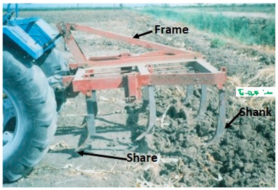 The research procedure depended on collecting data from previous studies of actual tillage field experiments, which were achieved under field conditions in different soil textures with different percentages of sand (Sa), silt (Si), and clay (Ca) contents. Based on the percentages of sand, silt, and clay contents in the investigated soils, the classified textures were clay loam, silty clay loam, sandy clay loam, silty clay, and clay. The collected data from previous studies of actual tillage field experiments comprised different variables, namely initial soil bulk densities (IBSD, g/cm3), tillage depths (TD, cm), and initial soil moisture contents (IMCS, db %). The data had different chisel plows with different widths hitched to different tractor powers. However, Figure 1 shows a picture of the chisel plow and its components. Because it is so simple to use, the chisel plow is the most often used plow. It penetrates the soil to a comparatively great depth. Additionally, because it fractures and loosens the soil without turning it, it does not leave big clumps on the soil surface after plowing [29].