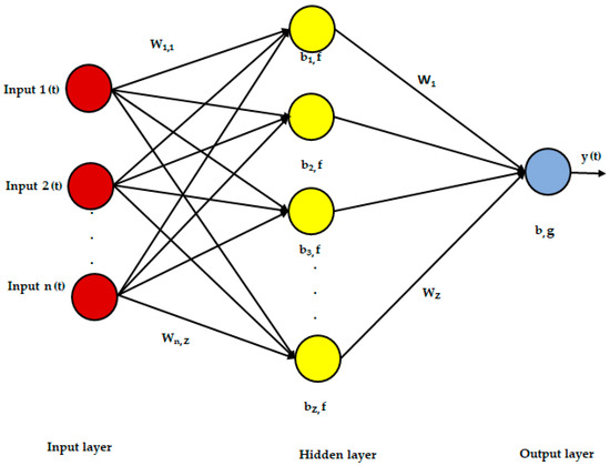 Feed-forward neural networks are classically simple networks that connect inputs and outputs. In a feed-forward ANN, information is passed forward from the input layer, through the hidden layers, and towards the output layer [40], as illustrated in Figure 2. In Figure 2, the input layer (red) consists of N nodes (X1(t), X2(t), …, Xn(t)), which represent the number of observed values used as input variables for the developed ANN. The hidden layer has M nodes (yellow) and the output layer has only one node (blue), which creates the predictor variables, where t signifies the sampling step. The output of the hidden layer is stated as follows [41]: