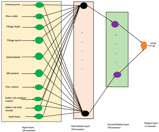Machine learning tools have become widely used in engineering and technical activities due to their exceptional benefits for multiple-variable prediction of nonlinear connections [1]. One of the most widely used machine learning approaches is ANN. However, ANN is suitably used in several tractor performance research domains during tillage operation [1]. The literature provides information on different reports on ANN simulation environment uses [18,19,20,21,25,26,27,28]. However, using different ANN approaches for modeling tractor performance at different field conditions in tillage operations, in particular, specific fuel consumption, the authors did not present any of models that determine SVFE from operation and soil conditions including variables like initial soil moisture content, plow width, tillage depth, sand, silt, and clay proportions in the soil, initial soil bulk density, tractor power, and tillage speed. Consequently, the current study aims at the assessment of performance of tractor–chisel plow systems, based on SVFE, and to create a suitable model of prediction it using an ANN typical model that can be used as a simulation strategy for simultaneous fluctuations of operational and soil influences. For this purpose, draft force data and hourly rate of tractor fuel consumption were collected from previous studies. These studies involved different initial soil moisture content, sand, silt, and clay proportions in the soil, tractor power, plow width, initial soil bulk density, tillage depth, and tillage speed. Therefore, the present study aims to evaluate recommendations that have been given for fitting operating parameters and soil conditions to maximize fuel efficiency.