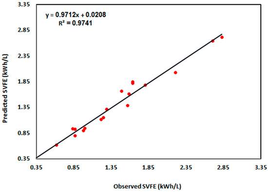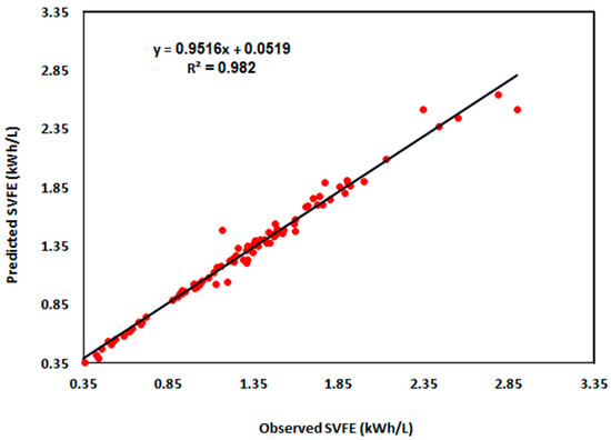 In the literature [64], the level of acceptability of the prediction based on the MAPE is 10%. The MAPEs for the training and testing datasets obtained satisfactory levels in the range of 3.056–6.908%, depending on the predicted variable. The mean absolute error (Table 4) for SVFE prediction during training was less than 1 kWh/L. The network was able to accurately learn the training dataset, as evidenced by Figure 5 and Figure 6, which display the curve fitting for the observed values against the output values of the ANN for the SVFE for the training and testing data, respectively. The coefficient of determination, or R2, for the data was determined to be 0.9820 and 0.9741 in the training and testing stages, respectively. Furthermore, this outcome shows that the measured and anticipated data have a proper association. Compared to other research findings, the acquired results are typical and appropriate given the vast number of input parameters used in this study. The results also show that all of the input factors influence the SVFE. Additionally, the figures show how the constructed ANN model consistently produced the modeled values during the test phase.