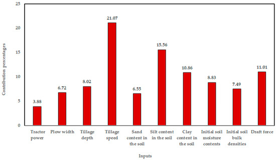 Sensitivity analysis or contribution percentages are effective methods to identify the influencing inputs on SVFE in the current study, which were derived from evaluating the actual field tillage trials. It automatically identifies all input parameters that affect the output in a trained feed-forward neural network. The percentage contributions provide a great deal of information regarding the importance of the various factors of output [47]. Furthermore, the program Qnet v2000’s input node interrogator option might be used to determine the contribution percentage of each input in an ANN using the sensitivity approach. By repeatedly running the training patterns process with every input and calculating the network’s output, this option is utilized to find the sensitivity. Furthermore, it is essential to keep in mind that the interpretation of this sensitivity finding was predicated on the idea that the input value is independent.