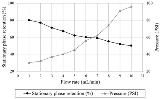 Based on the evaluation of how different mobile phase flow rates influenced stationary phase retention (Figure 1), a flow rate of 10 mL/min was identified as the most suitable for achieving effective separation of β-carotene. This setting enabled a more time-efficient operation, while preserving a satisfactory retention of the stationary phase within the column (Sf: 50%, as calculated by Equation (1)), and ensured that system pressure remained safely below the maximum threshold of 250 PSI.