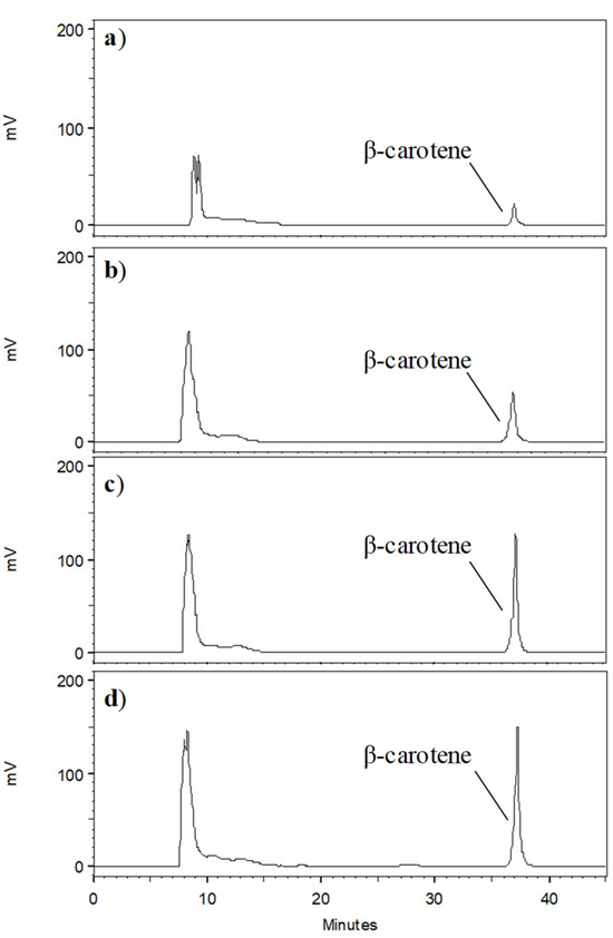 β-carotene has been extracted from algal biomass using a variety of conventional techniques. These include pressurized liquid extraction with organic solvents such as ethanol and 2-methyltetrahydrofuran [4]; sequential extraction using methanol [5]; ultrasound-assisted extraction with a solvent mixture of hexane and ethanol [6]; extraction using tetrahydrofuran and acetone following cell disruption with glass beads [7]; ultrasound-assisted extraction combined with final purification via solid–liquid chromatography [8]; acetone extraction followed by high-performance thin-layer chromatography; and purification through flash chromatography [9]. In addition, β-carotene has been recovered using supercritical fluid extraction, including supercritical CO2 [10,11,12,13,14,15,16]. While these methods have proven to be effective on a laboratory scale, several challenges remain when considering industrial implementation. Others are associated with high operational costs, complex instrumentation, or limited selectivity for hydrophobic compounds such as β-carotene.