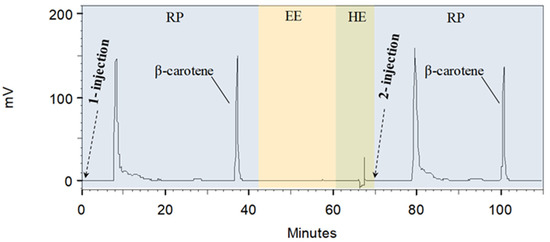 Using the previously optimized conditions, a sequential two-cycle HPCCC protocol was successfully applied for the isolation of β-carotene from Dunaliella sp. biomass extract (Figure 3). In each cycle, 800 mg of algal extract was introduced, processing a total of 1.6 g over two runs. The complete HPCCC procedure lasted a total of 137.5 min. This duration encompassed 13.5 min for initially filling the first column with the upper phase at a flow rate of 10 mL/min, followed by a 10 min equilibration step in which the lower phase was introduced at 10 mL/min to establish liquid phase balance within the column. The remaining 114 min was dedicated to conducting two consecutive separation cycles. Each of the two HPCCC cycles consisted of three phases: (1) the separation of β-carotene using reverse-phase elution with the lower phase pumped at 10 mL/min for 42 min; (2) the extrusion of the stationary phase by switching to upper phase flow for 20 min; and (3) the achievement of the hydrodynamic equilibrium of two immiscible liquid phases inside the column for another 10 min. The overall chromatographic profile of the entire process is presented in Figure 3. It is relevant to note that for future scale-up into production, the duration of the steps could likely be optimized in further studies and, thus, reduced. Throughout the two-cycle process, 1.375 L of solvents were consumed, yielding 225.4 mg of β-carotene at a purity of 97%. Given that the β-carotene concentration in the dried Dunaliella sp. extract was measured at 14.396 mg per 100 mg extract, the recovery efficiency of the developed HPCCC method reached 98%. Figure 4a displays the HPLC-DAD chromatogram of the Dunaliella sp. biomass extract, while Figure 4b presents the chromatogram of the corresponding isolated fraction. The comparison highlights the effectiveness of the HPCCC technique in achieving the selective separation of β-carotene.