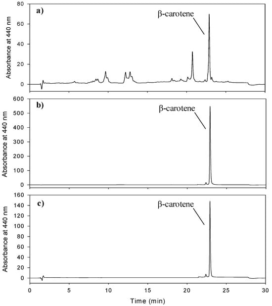 (a) HPLC-DAD chromatogram of the crude Dunaliella sp. extract, (b) chromatogram of the β-carotene-enriched fraction obtained after HPCCC purification, and (c) chromatogram of the β-carotene reference standard (Sigma Aldrich). All chromatograms were recorded at 440 nm.