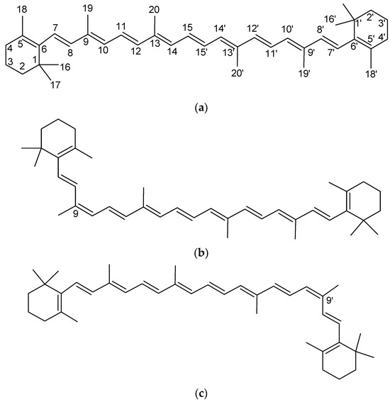 Chemical structure of all-trans-β-carotene (a), 9-cis β-carotene (b) and 9′-cis β-carotene (c).