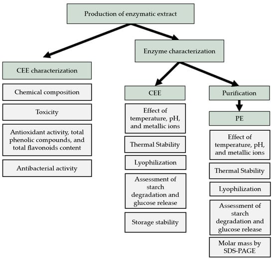 Figure 1 presents a flowchart summarizing the steps involved in the production, characterization, and purification of the CEE, and the functional analysis of the purified enzyme (PE). The process begins with the production of the enzymatic extract, followed by the characterization of the CEE, including assessments of chemical composition, toxicity, antioxidant activity, antibacterial activity, and storage stability. In parallel, the extract undergoes a purification process to isolate the amylase enzymes.