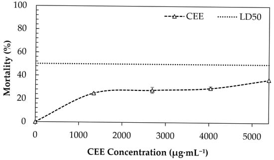 The acute toxicity assay with A. salina enables the determination of the median lethal dose (LD₅₀), defined as the concentration required to cause 50% mortality in the test population []. Figure 2 presents the results of the toxicity assay using A. salina. According to the World Health Organization (WHO), substances with an LD₅₀ below 1000 µg·mL−1 are considered toxic, while those with an LD₅₀ between 100 and 500 µg·mL−1 are classified as mildly toxic. Extracts with an LD₅₀ above 1000 µg·mL−1 are considered non-toxic [,]. In the present study, concentrations above 1000 µg·mL−1 of the CEE were tested, and no LD₅₀ was reached, as shown in Figure 2. Therefore, the CEE was not considered toxic at any of the concentrations evaluated.