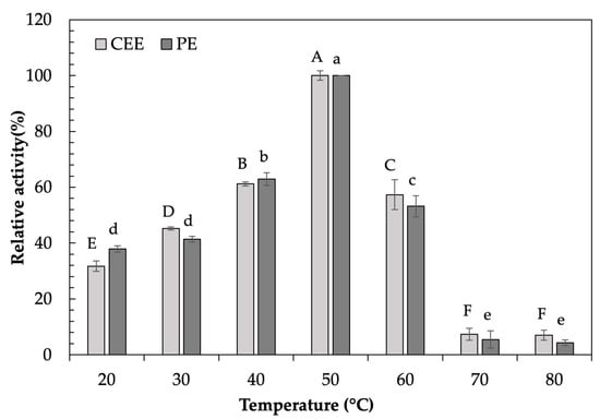 Relative enzymatic activity of CEE and PE at different temperatures (20, 30, 40, 50, 60, 70, and 80 °C). Different letters indicate statistically significant differences (p ≤ 0.05). Tukey’s test was performed separately for CEE and PE.