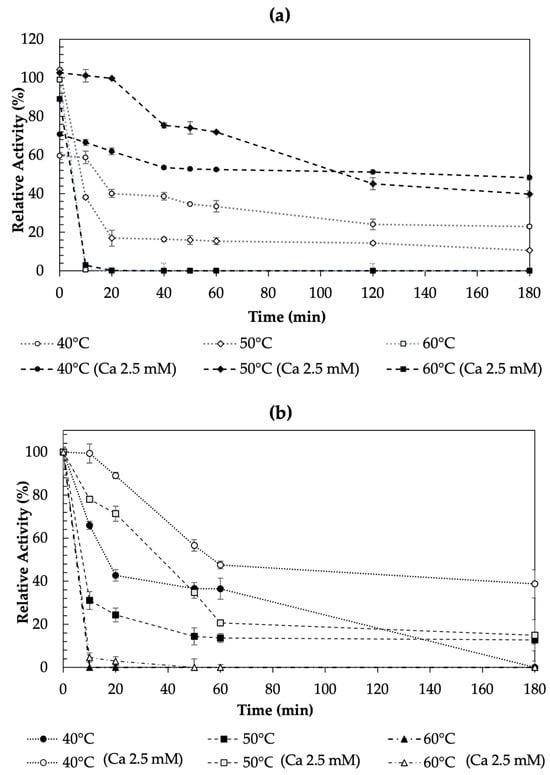 The thermal stability of CEE and PE was evaluated at 40, 50, and 60 °C in a water bath over 3 h. Aliquots were collected every 10 min during the first hour, and subsequently at 2 and 3 h. Enzyme activity was measured as previously described (Section 2.5.1). An additional test was performed using acetate buffer (0.1 M) supplemented with 2.5 mM calcium to assess the stabilizing effect of calcium ions.