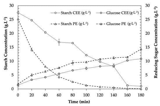 To evaluate hydrolytic activity, 100 μL of CEE or PE (with an enzyme activity of approximately 140 U·mL−1) was added to 1.9 mL of a 3% (w/v) starch solution and incubated at 50 °C for 180 min. Samples were withdrawn every 20 min, cooled in an ice bath, and analyzed for starch and glucose content. Starch concentration was determined using the iodine/iodide method [,], and glucose (C₆H₁₂O₆, ≥99% w/w; Synth, Diadema, SP, Brazil) content was measured using the glucose oxidase–peroxidase (GOD/POD) method [,].