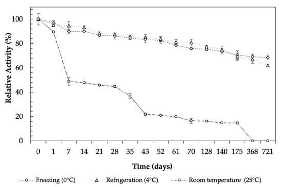 The storage stability of the CEE was monitored by measuring its enzymatic activity (as described in Section 2.5.1) after storage at 0 °C (freezing), 4 °C (refrigeration), and 25 °C (room temperature) for a period of 721 days.