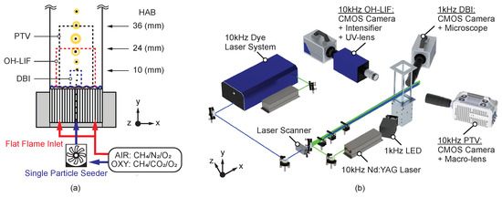 (a) A schematic of the laminar flow reactor and the measurement field of view. Different inlet gas mixtures were used in AIR and OXY conditions. (b) The optical setup for the multi-parameter measurements [34].